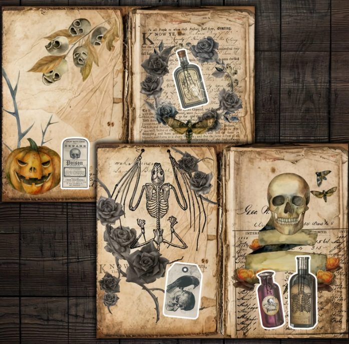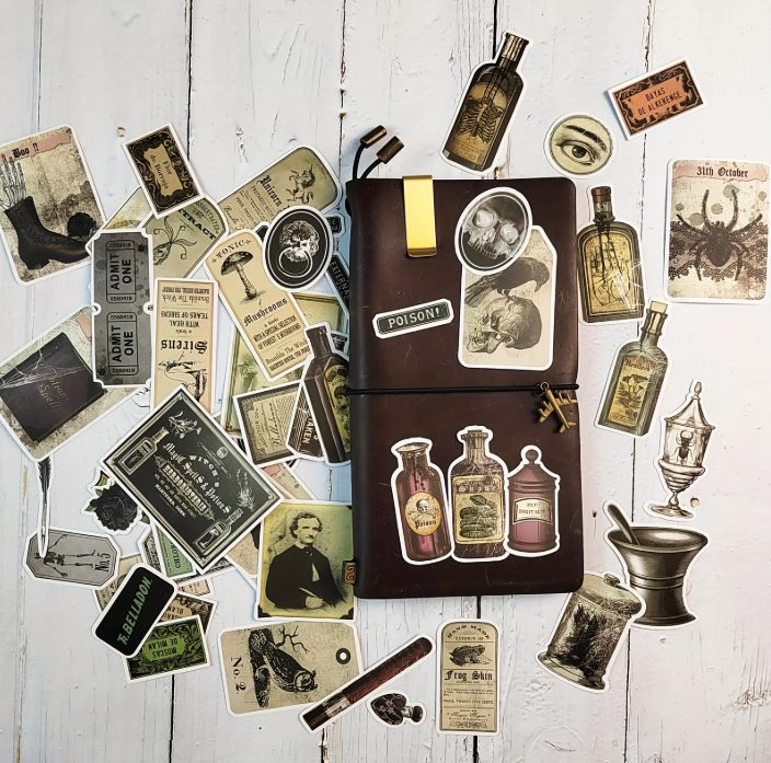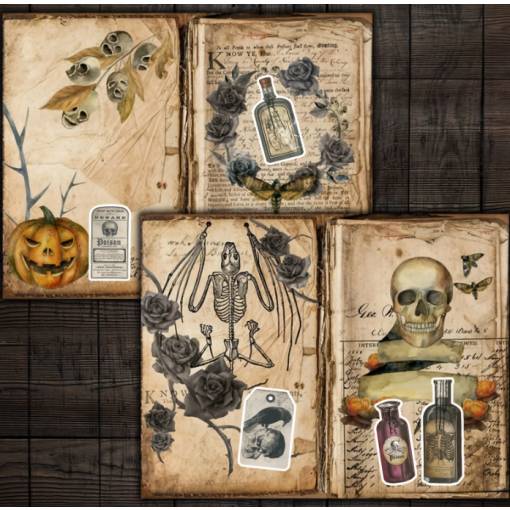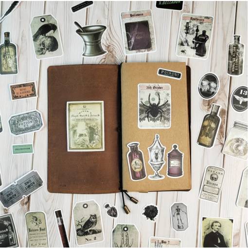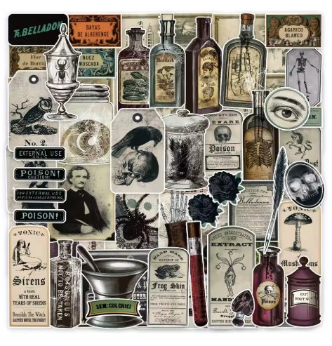 Set tematic de autocolante inspirat de estetică gotică și horror. Vei găsi etichete retro pentru poțiuni, motive întunecate și elemente decorative care vor adăuga un strop de originalitate proiectelor tale.