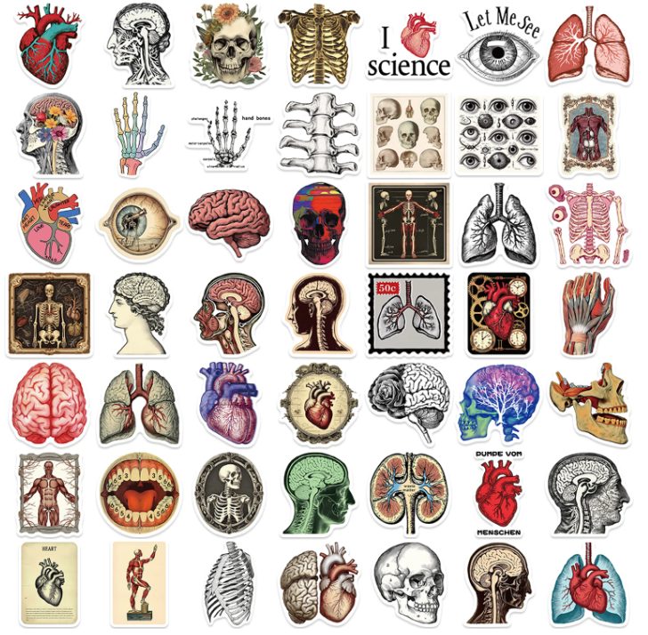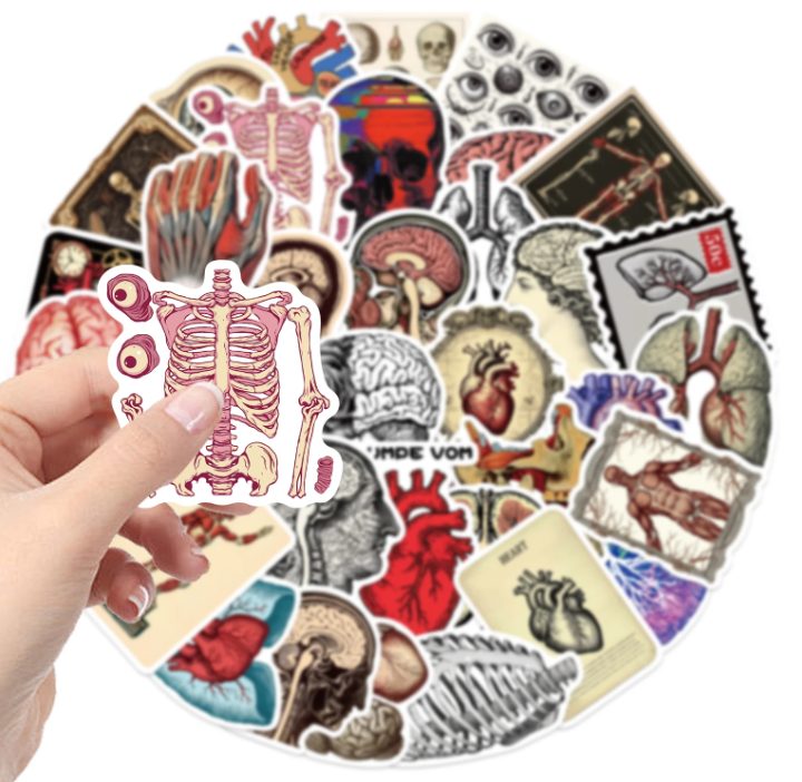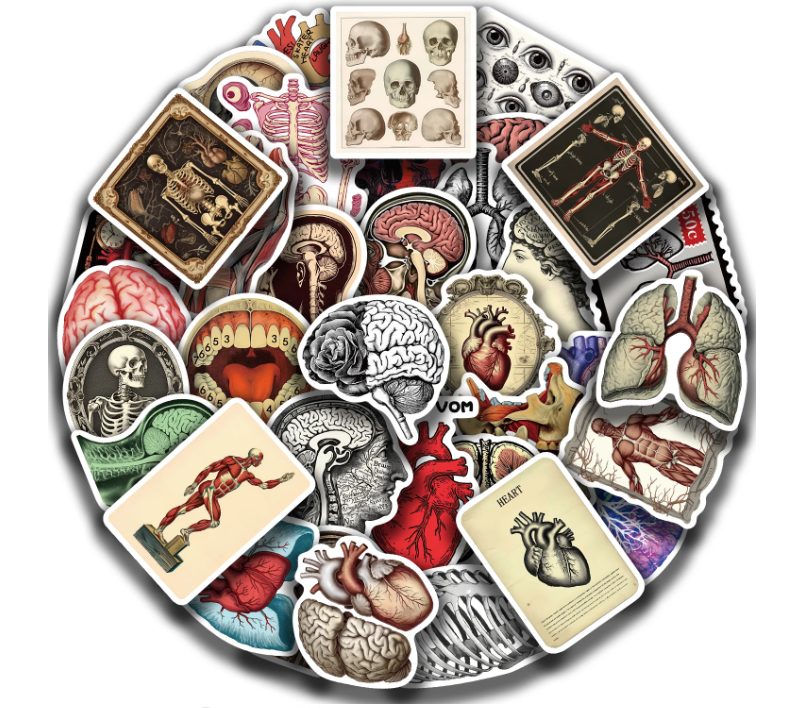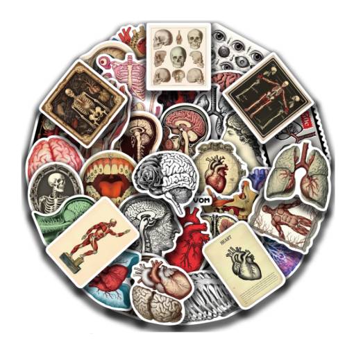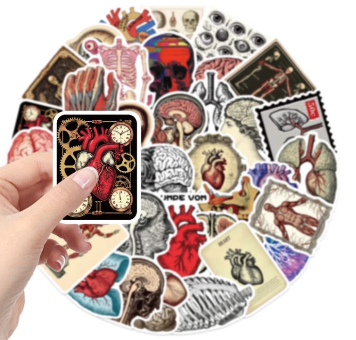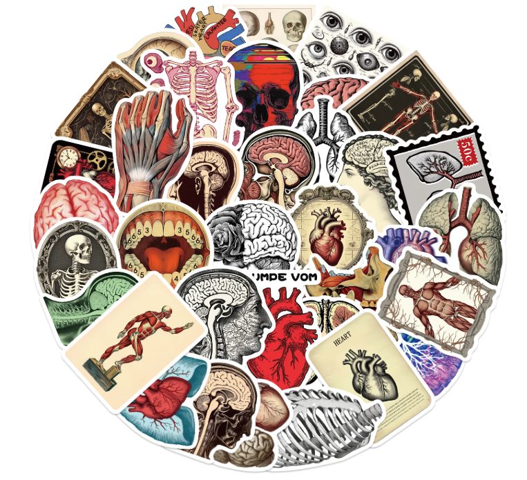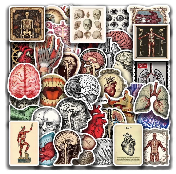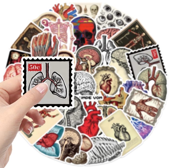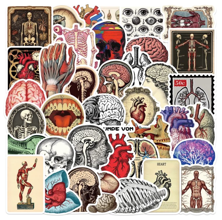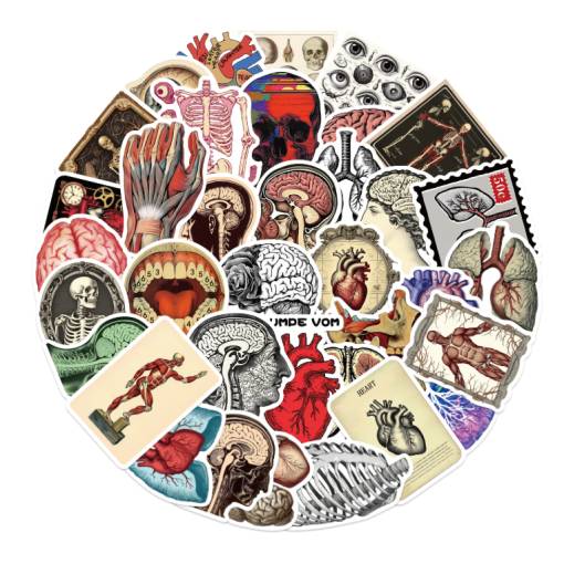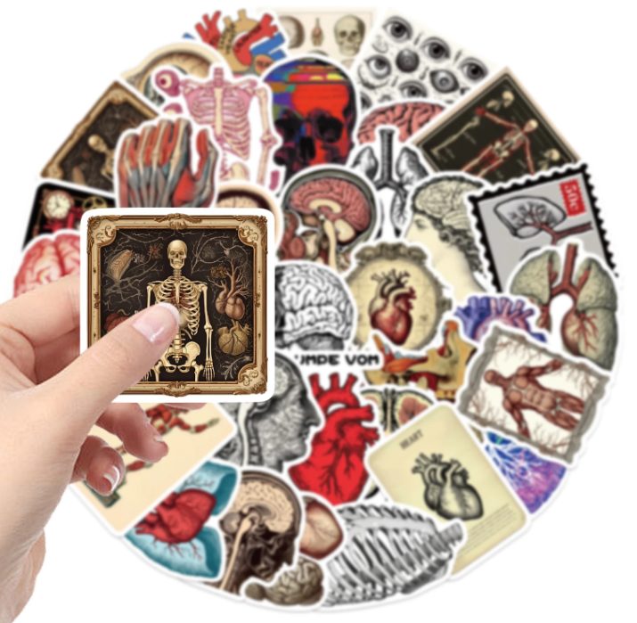 Fiecare autocolant are un design unic cu o notă de estetică retro – inclusiv ilustrații ale corpului uman, detalii anatomice și desene științifice vechi.