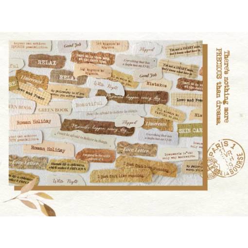 Set original de 50 de autocolante cu motive de text, care adaugă un aspect unic obiectelor tale. Autocolantele sunt fabricate din hârtie ecologică cu o textură granulată.