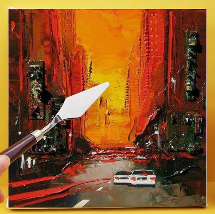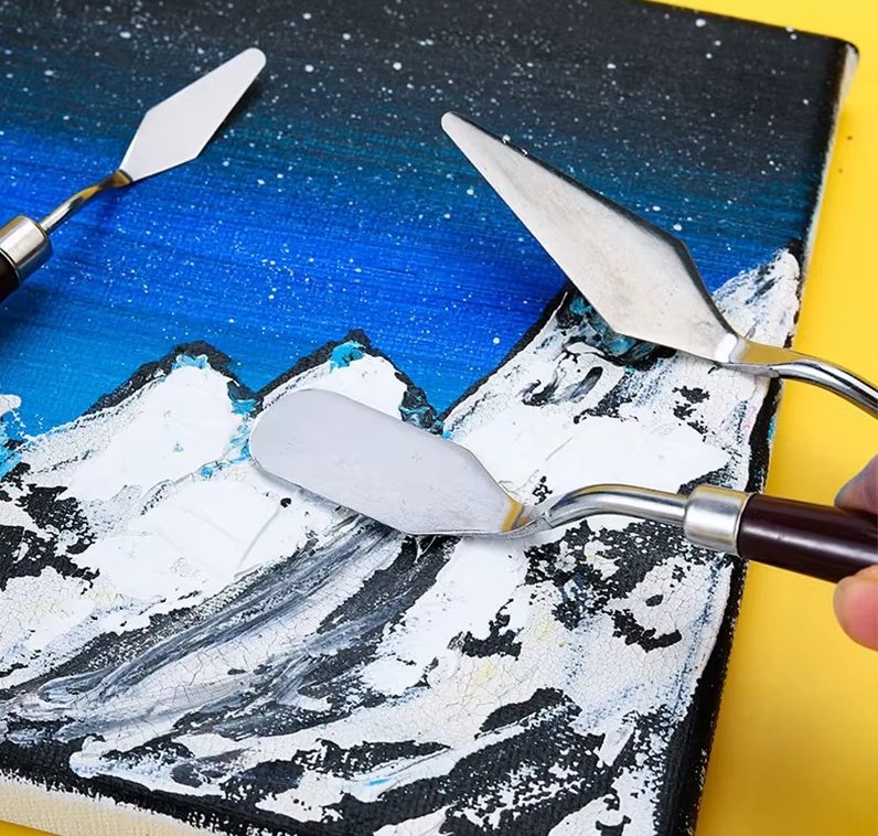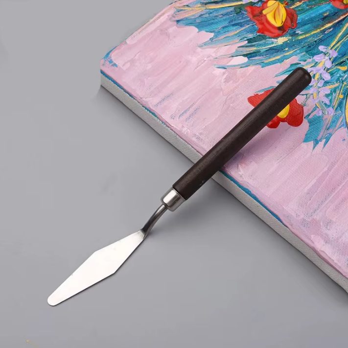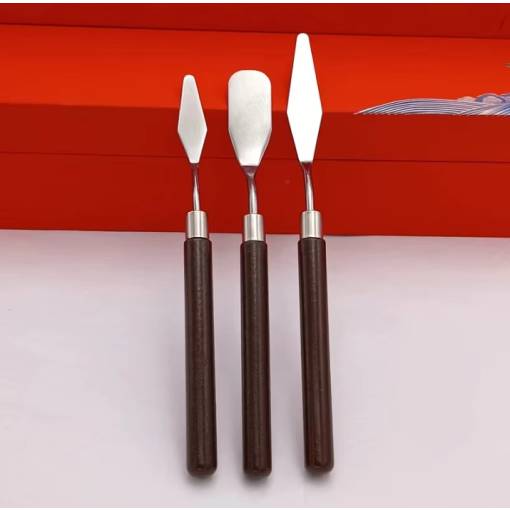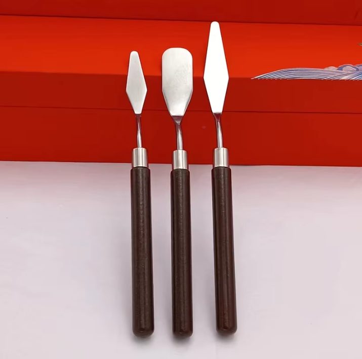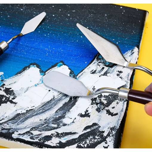 - Spatula paletă (palette knife) – pentru amestecarea culorilor pe paletă și aplicarea straturilor texturate.