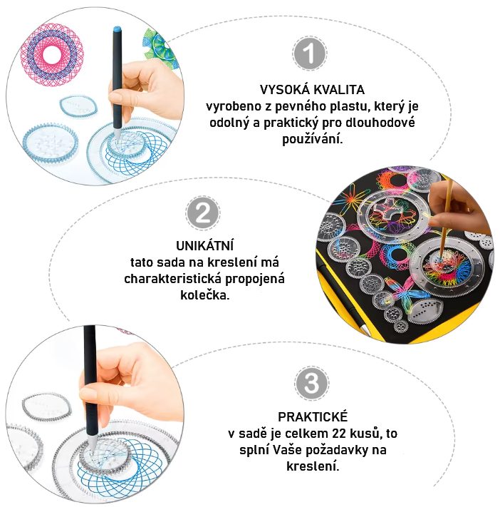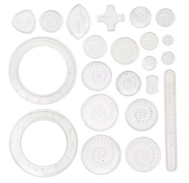 Roțile dințate interconectate permit crearea a mii de modele și forme unice, astfel încât să poți dezvolta imaginația și abilitățile motorii fine la fiecare utilizare.