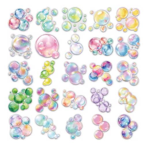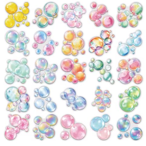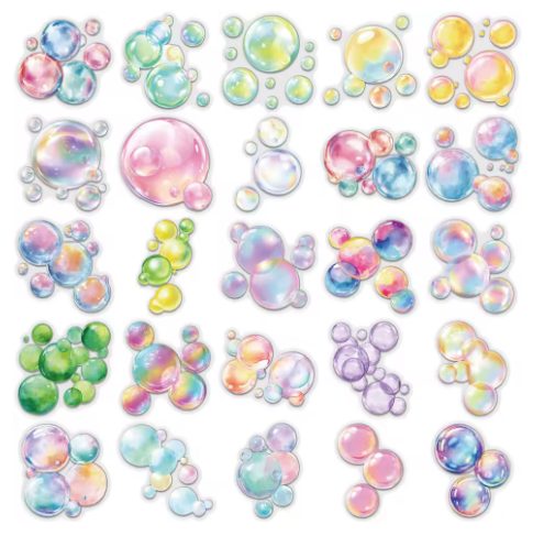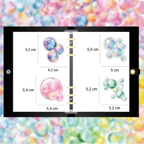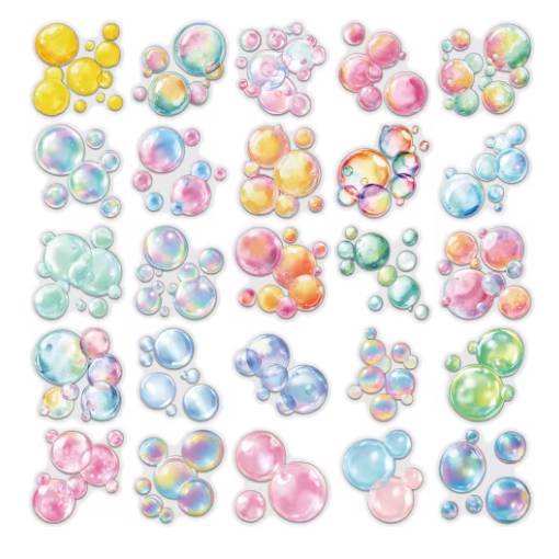 Învie-ți creațiile cu bule colorate jucăușe din material PET transparent. Aceste autocolante decorative adaugă proiectelor tale un ușor efect 3D, ușurință și o structură interesantă.
