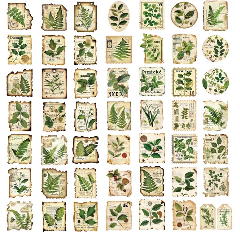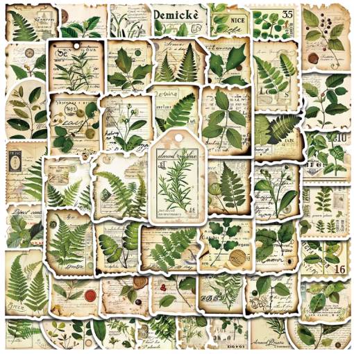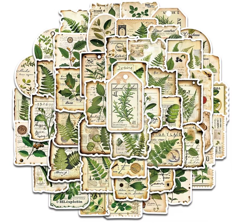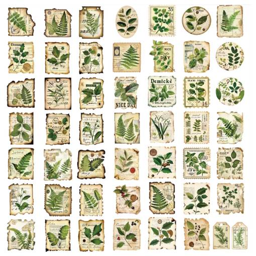 Decorează-ți proiectele de scrapbooking, jurnale, telefoane, skate-uri sau sticle de cafea cu acest set de 50 de autocolante stilizate cu teme de plante forestiere.